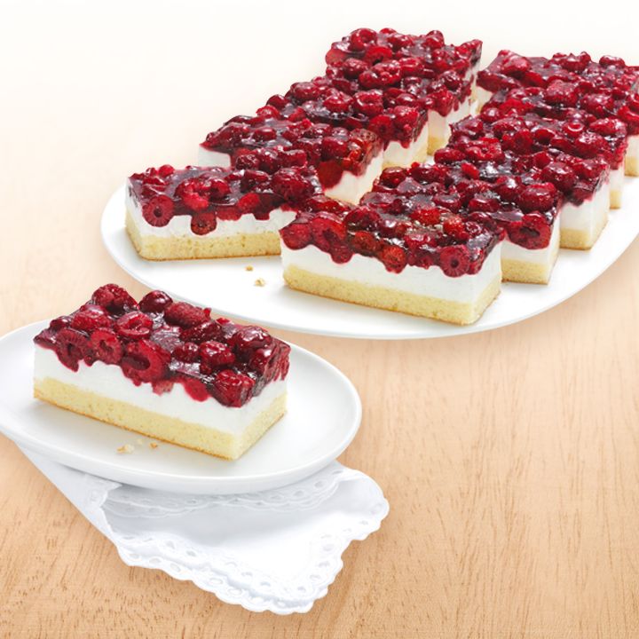 <ul><li>Käse-Sahne-Füllung auf einem saftigen Mohn-Rührteigboden</li><li>Darauf eine aromatische Himbeer-Zubereitung mit Tortenguss abgeglänzt</li><li>Zum Verkauf im Bäckerblech bestens geeignet</li><li>Vorgeschnitten in 12 Stücke, 1.9500 g, ca. 19,5 x 29 cm</li></ul>