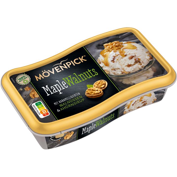 Setzen Sie eine Kugel cremiges MÖVENPICK Maple Walnut auf einen Soßenspiegel und kombinieren Sie diese mit einem Stück spanischen Mandelkuchen.