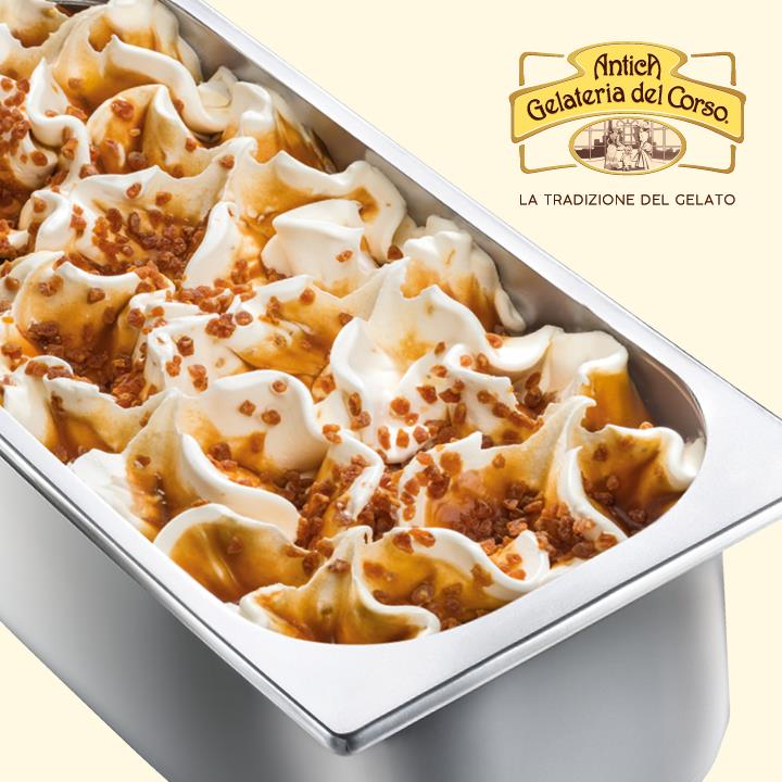 Vanilleeis mit gesalzener Karamellsauce (8 %) und karamellisierten Zuckerstückchen (4 %).Nettogewicht pro VE
