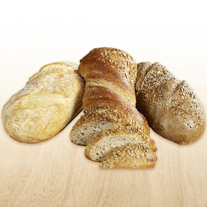 Mischkarton mit jeweils zwei Rusti-Natur (Weizenbrote), zwei Rusti-Spezial (Weizenmischbrote) und zwei Zwirbel-Broten (Weizenmischbrote), vorgebacken, tiefgefroren.Conveniencegrad