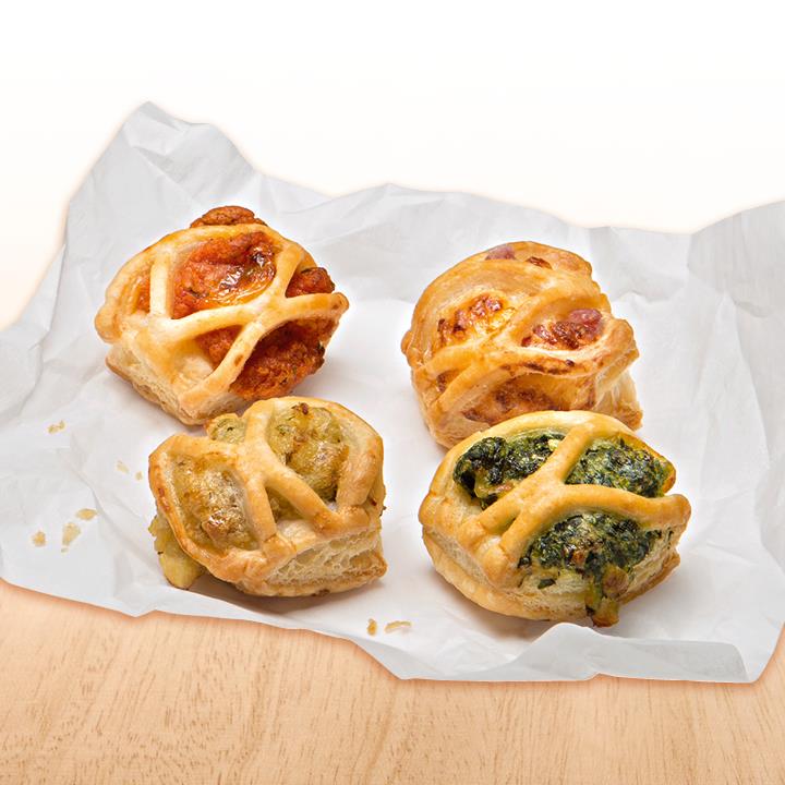 Spinat Weißkäse- Minis: Blätterteigteilchen mit einer Spinat-Weißkäse-Füllung, tiefgekühlt; Champignon- Minis: Blätterteigteilchen mit einer Champignonfüllung, tiefgekühlt; Käse Kochschinken- Minis: Blätterteigteilchen mit einer Käse-Kochschinken-Füllung, tiefgekühlt; Tomate- Mozzarella Minis: Blätterteigteilchen mit einer Tomaten-Mozzarella-Füllung, tiefgekühltConveniencegrad