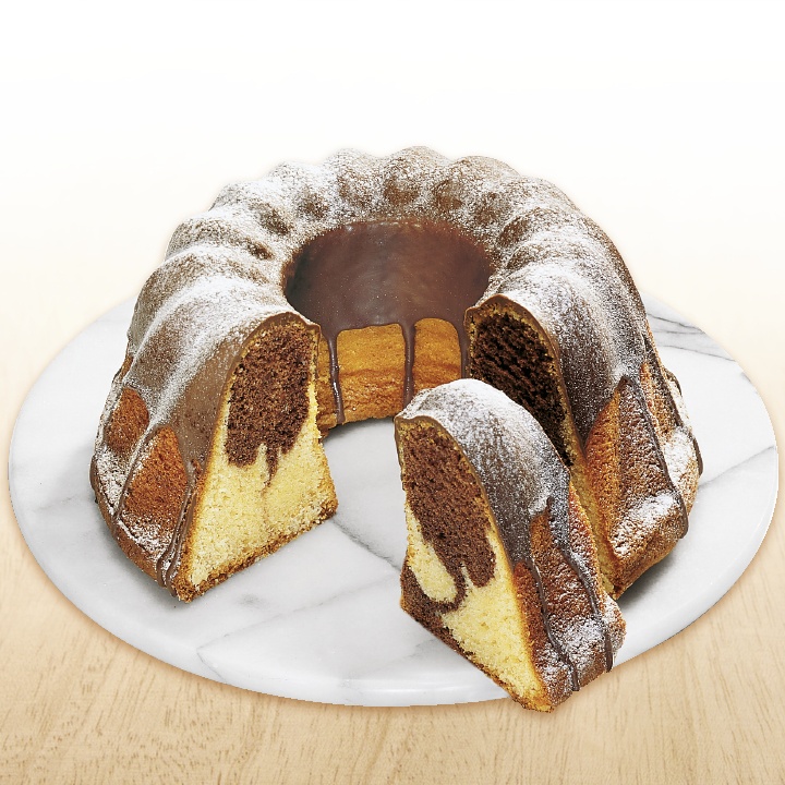 Ein Marmorkuchen mit kakaohaltiger Fettglasur (8%) überzogen und mit Puderzucker bestreut, fertig gebacken, tiefgefroren.Conveniencegrad