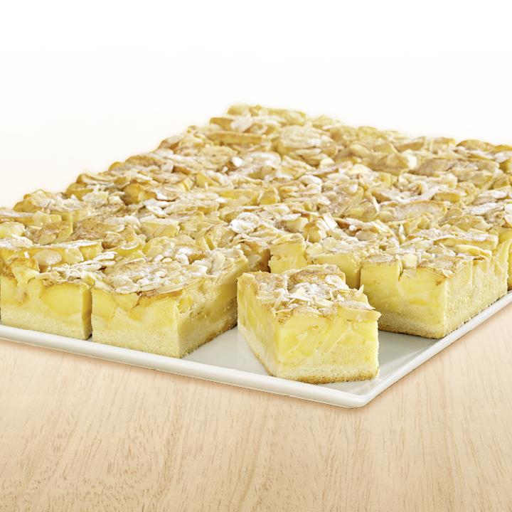 Mürbeteigboden mit Rührteig und Äpfeln, mit gehobelten Mandeln und Zucker-Zimt-Mix bestreut und Dekorzucker abgepudert, tiefgefroren, vorgeschnitten in 20 Portionen.Conveniencegrad