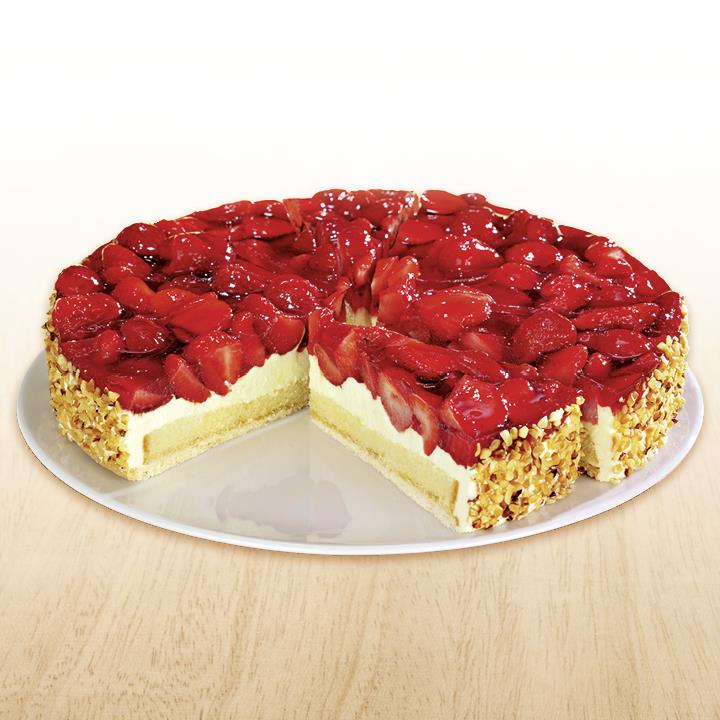 Mürbeteig- und Biskuitboden mit Sahnepuddingcreme (29%) und halben Erdbeeren, mit Tortenguss überzogen und gehackten gerösteten Haselnüssen randgarniert, tiefgefroren, vorgeschnitten in 12 Portionen.Conveniencegrad