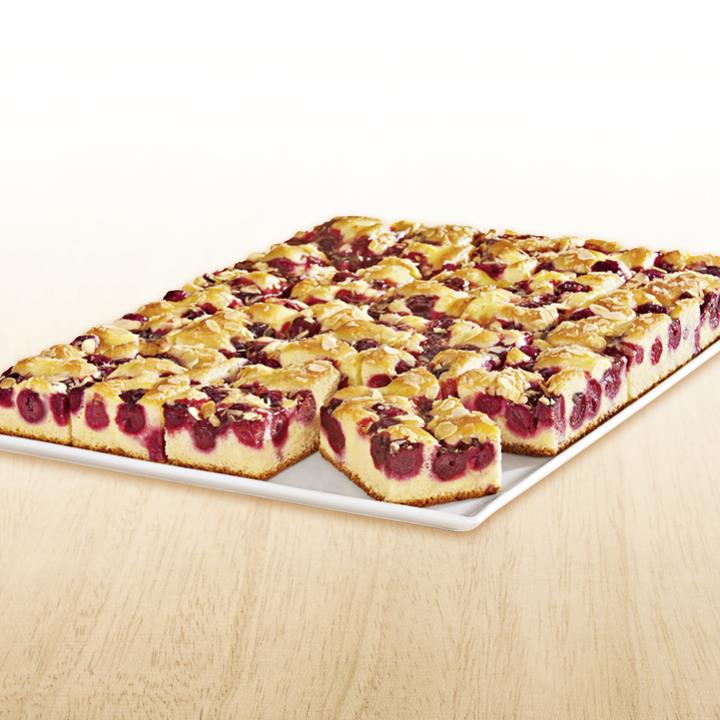 Rührteigboden mit Puddingcreme (16%) und Sauerkirschen, mit Tortenguss abgeglänzt und gehobelten gerösteten Mandeln bestreut, tiefgefroren, vorgeschnitten in 20 Portionen.Conveniencegrad