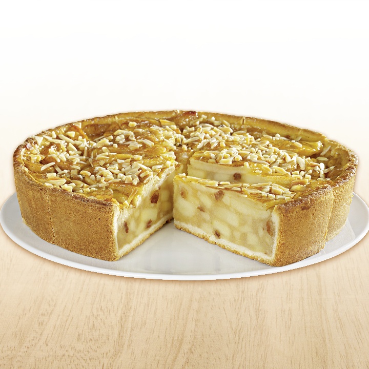 Mürbeteigboden mit Apfelfüllung (59%) und Apfelringen (15%), mit Tortenguss abgeglänzt, tiefgefroren, vorgeschnitten in 14 Portionen.Conveniencegrad