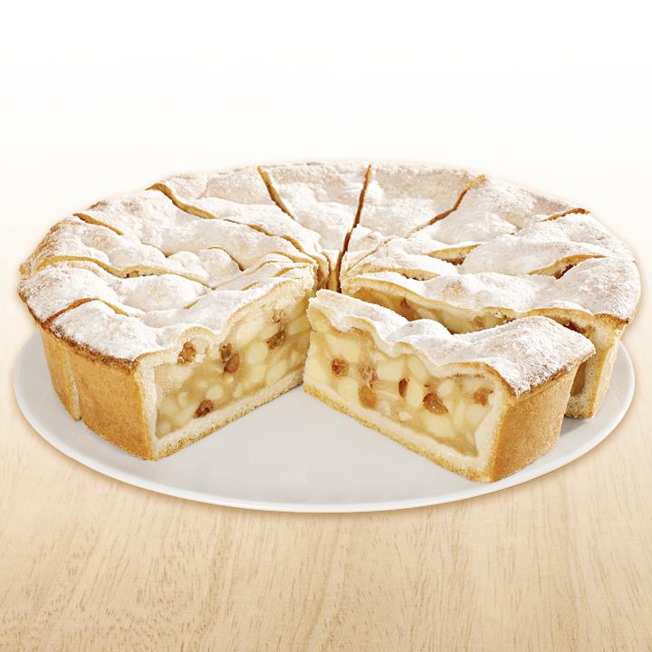Mürbeteigkuchen mit Apfel-Füllung (71%), mit Tortenguss abgeglänzt und Dekorzucker abgepudert, tiefgefroren, vorgeschnitten in 14 Portionen.Conveniencegrad