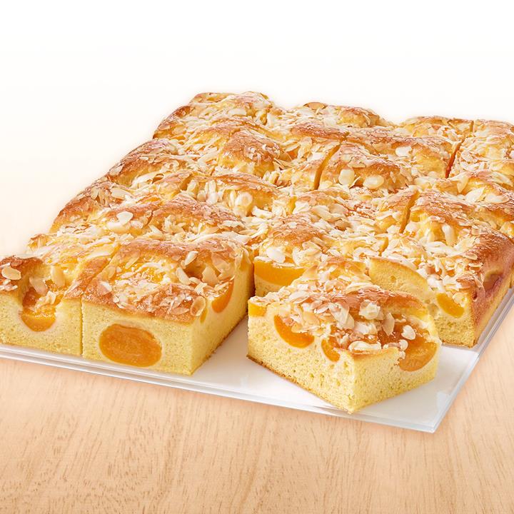 Rührteigkuchen mit Aprikosen / Marillen, mit Tortenguss abgeglänzt und gehobelten, gerösteten Mandeln dekoriert, tiefgefroren, vorgeschnitten in 16 Portionen.Conveniencegrad
