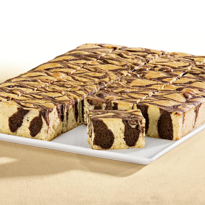Marmorkuchen aus hellem und dunklem Rührteig, tiefgefroren, vorgeschnitten in 32 Portionen.Conveniencegrad