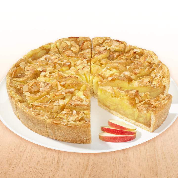 Mürbeteigboden mit Apfel-Füllung (46%) und Apfelspalten (28%), mit Zucker-Zimt-Mix abgepudert, Tortenguss abgeglänzt und gehobelten gerösteten Mandeln dekoriert, tiefgefroren, vorgeschnitten in 12 Portionen.Conveniencegrad