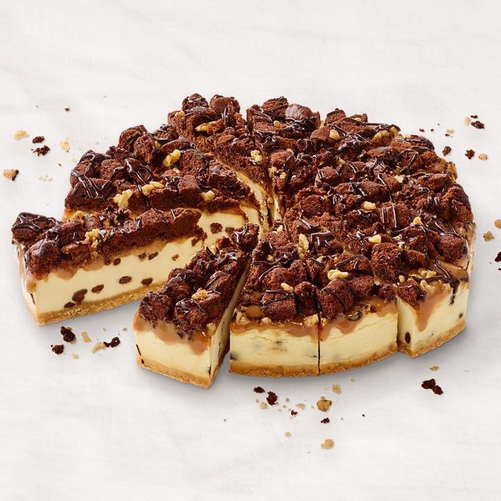 Käsemasse (59%) mit Schokoladen-Tropfen (3%) auf einem Brösel-Mürbeteigboden, mit Karamell-Creme (9%), Walnuss-Stücken und Brownie-Kuchen-Würfeln (7%) belegt und mit kakaohaltiger Fettglasur dekoriert, tiefgefroren, vorgeschnitten in 14 Portionen.Conveniencegrad