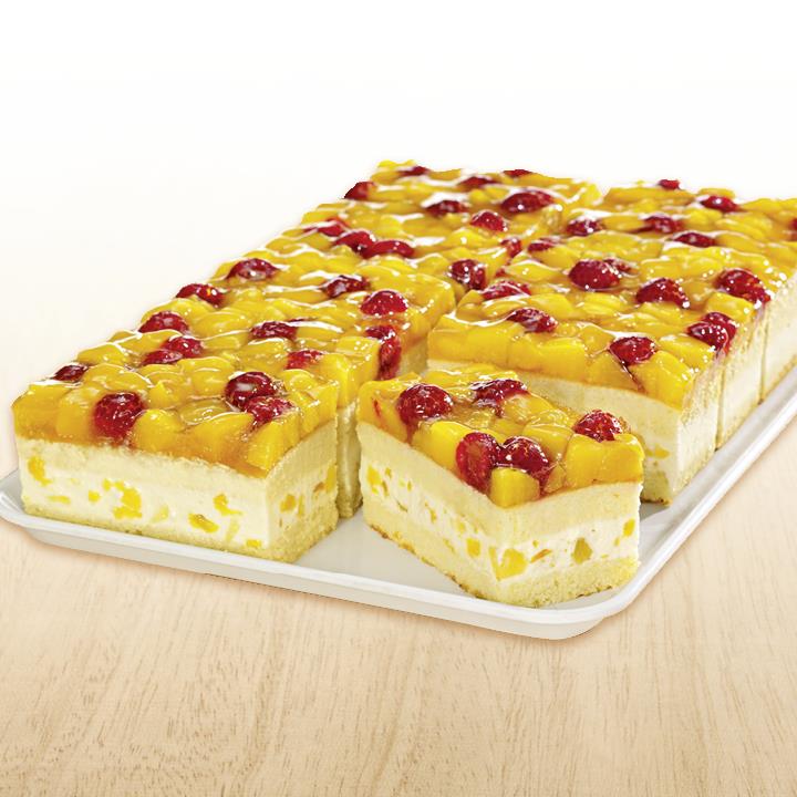 Vanille-Sahne-Füllung (26%) und Pfirsich-Ananas-Orangen-Zubereitung (9%) zwischen hellen Rührteigböden, mit Pfirsichen (17%) und Himbeeren (4%) dekoriert und Tortenguss abgeglänzt, tiefgefroren, vorgeschnitten in 12 Portionen.Conveniencegrad