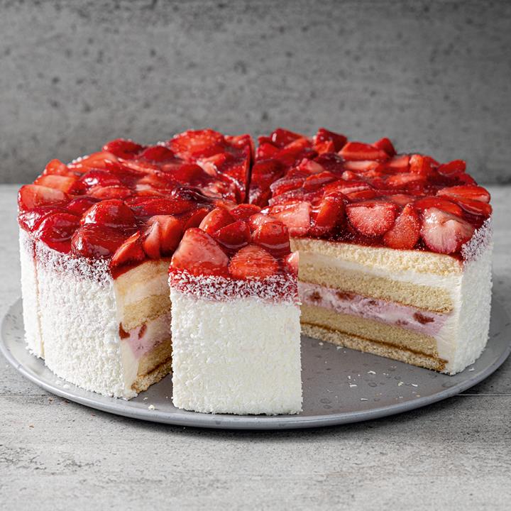 Buttermilch-Sahne- (15%), Erdbeer-Buttermilch-Sahne-Füllung (8%) und Erdbeer-Zubereitung (2%) zwischen zwei Rührteigböden auf einem Mürbeteigboden, darauf liegen Buttermilch-Sahne-Füllung (10%) und ein Biskuitboden, mit Erdbeer-Hälften (19%) belegt, Tortenguss abgeglänzt und Kokosnussraspeln randgarniert, tiefgefroren, vorgeschnitten in 12 Portionen.Conveniencegrad