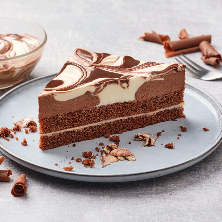 Zwischen zwei dunklen Rührteigböden liegt eine Schicht aus heller Fettglasur (13%) mit dünnen Keksblättchen. Darauf befindet sich eine mit Schokoladen-Rondies verfeinerte Mousse au Chocolat (AT: Kakaocreme) (25%), die mit weißer Mousse au Chocolat (AT: weißer Schokolade verfeinerter Creme) (21%) verstrudelt ist, mit Kakaocreme dekoriert, tiefgefroren, vorgeschnitten in 12 Portionen.Conveniencegrad