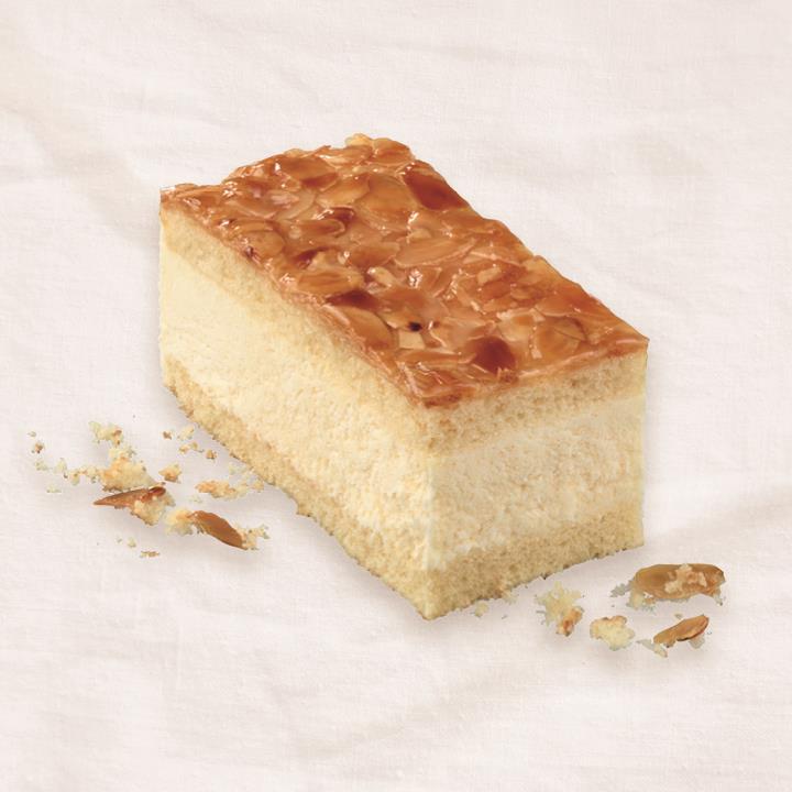 Rührteigböden mit Hefe, gefüllt mit Sahnepudding-Creme (60%) und einem Mandel-Belag mit Zuckerglasur bedeckt, mit Tortenguss abgeglänzt, tiefgefroren, vorgeschnitten in 12 Portionen.Conveniencegrad