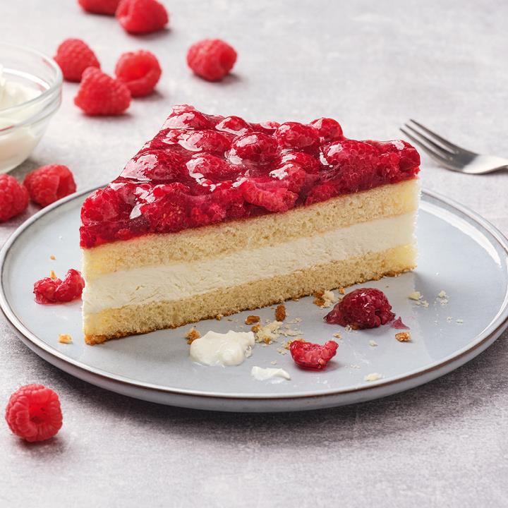 Käse-Sahne-Füllung (31%) zwischen zwei Rührteigböden, mit Himbeeren belegt und mit Tortenguss abgegelänzt, tiefgefroren, vorgeschnitten in 12 Portionen.Conveniencegrad