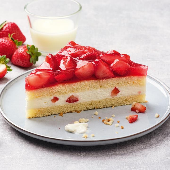 Erdbeer-Buttermilch-Sahne-Füllung (29%) zwischen zwei hellen Rührteigböden, mit Erdbeeren (21%) belegt und Tortenguss abgeglänzt, tiefgefroren, vorgeschnitten in 12 Portionen.Conveniencegrad