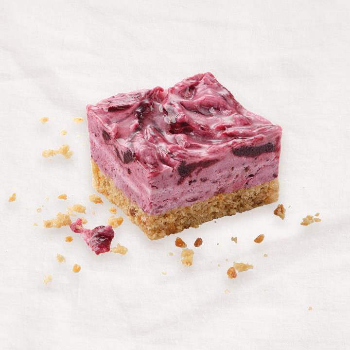 Mandelrührteigboden mit einer ungebackener Käsemasse (45%) und einer schwarzen Johannisbeeren-Zubereitung (30%), mit Tortenguss abgeglänzt, tiefgefroren, vorgeschnitten in 15 Portionen.Conveniencegrad