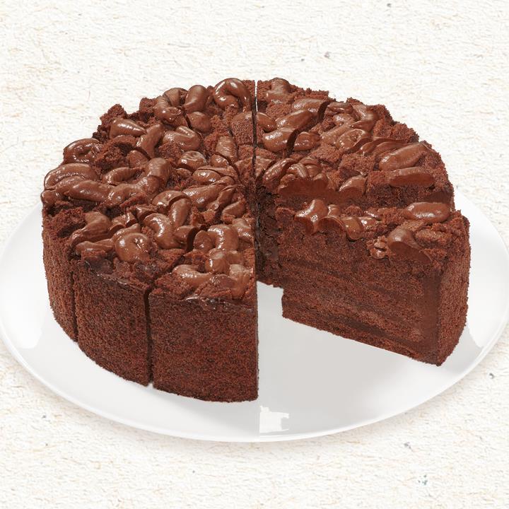 Zwischen Schichten aus dunklen Rührteigböden liegt Kakaocreme (45%), tiefgeforen, vorgeschnitten in 12 Portionen.Conveniencegrad