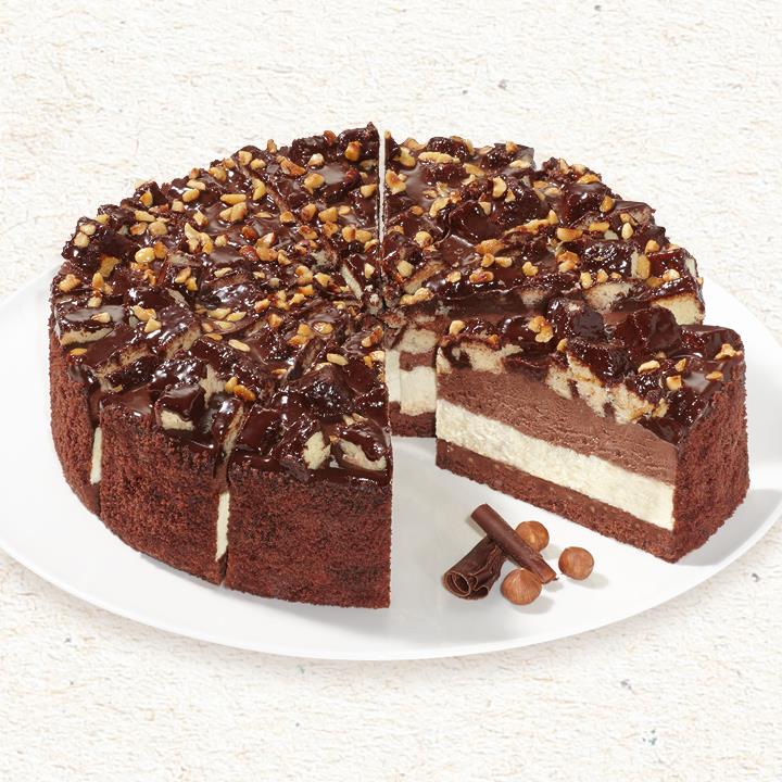Dunkler Rührteigboden mit Nougatcreme (8%) und dünnen Keksblättchen. Hierauf liegen eine helle Creme (26%) und eine mit Schlagsahne und Frischkäse verfeinerte Schokoladencreme (26%). Dekoriert mit Schokoladencreme (12%) und Rührteigwürfeln, tiefgefroren, vorgeschnitten in 12 Portionen, vorgeschnitten in 12 Portionen.Conveniencegrad