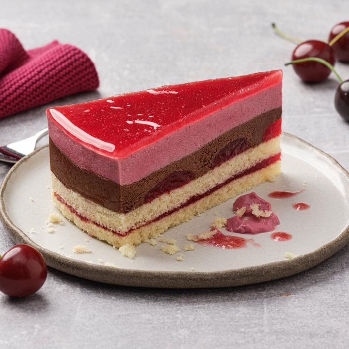 Zwischen zwei Rührteigböden befindet sich eine Sauerkirschzubereitung (9%), hierauf eine Sauerkirschzubereitung (11%), bedeckt mit einer Kakaocreme-Füllung (24%) und einer Sauerkirsch-Creme-Füllung (24%), mit Kirsch-Tortenguss (9%) und Tortenguss abgeglänzt, tiefgefroren, vorgeschnitten in 12 Portionen.Conveniencegrad