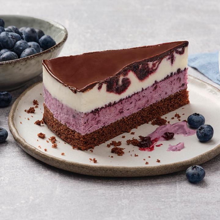 Auf einem dunklen Rührteigboden liegt eine Heidelbeercremefüllung (33%), bestreut mit Heidelbeer-Zubereitungs-Granulat (1%), hierauf eine Cremefüllung mit Vanillegeschmack (30%) mit Heidelbeer-Zubereitung (10%). Bedeckt mit Kakaocreme (9%), tiefgefroren, vorgeschnitten in 12 Portionen.Conveniencegrad